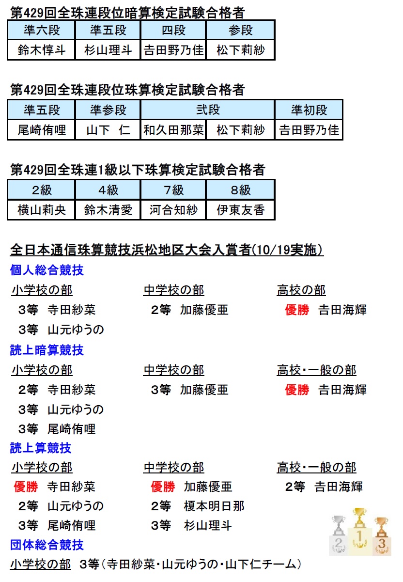 | 3等-8 | 山崎 澪 | 浜松市立篠原小学校 | 5 | 1080 |