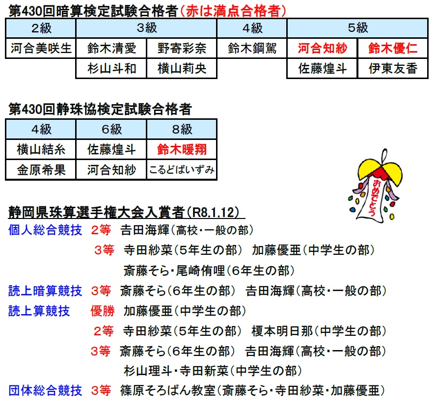 | 4級 | 鈴木 新之助 | 平出 柚奈 | 澤井 恒明 | 鈴木 崚太 | 鈴木 心菜 |