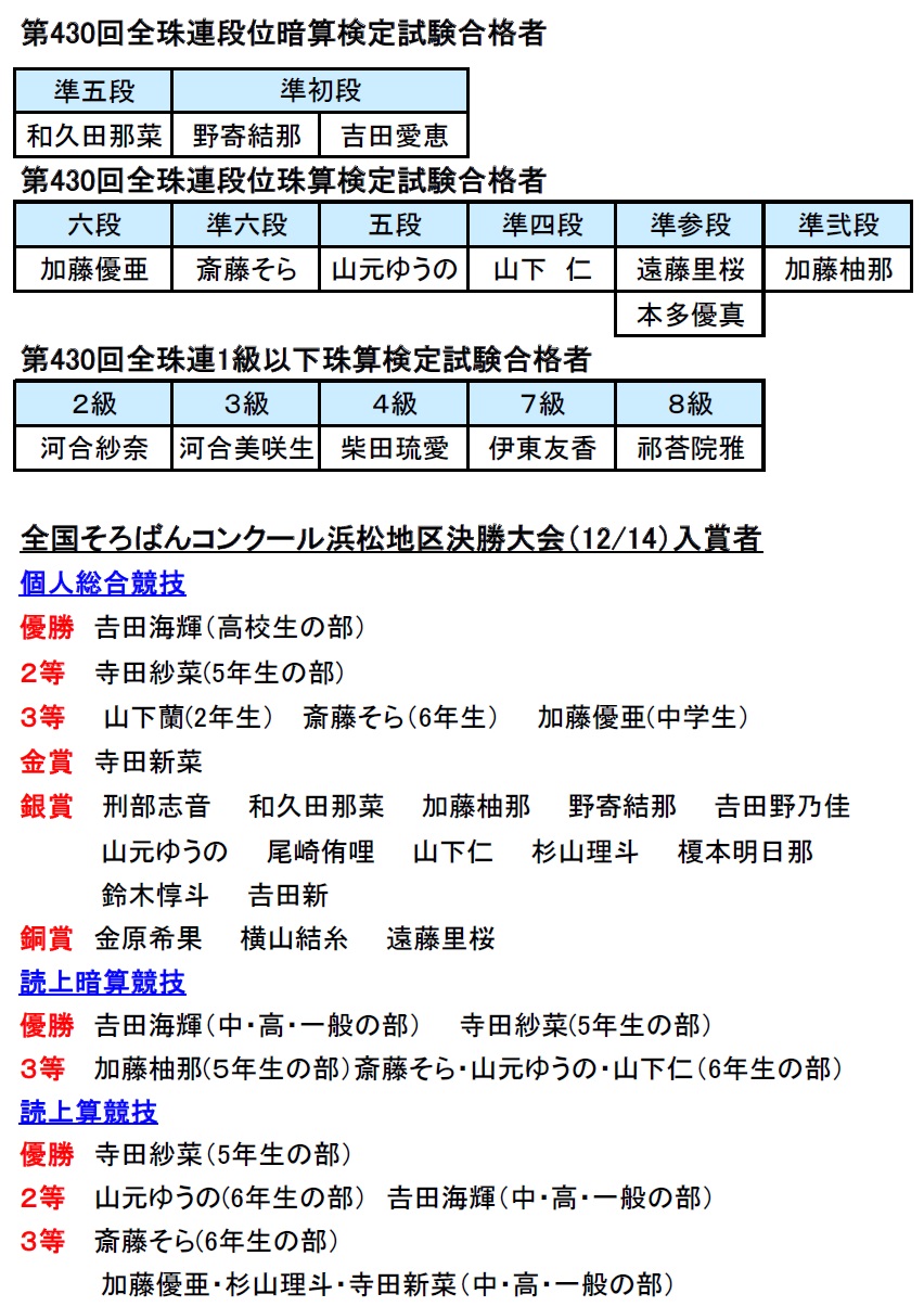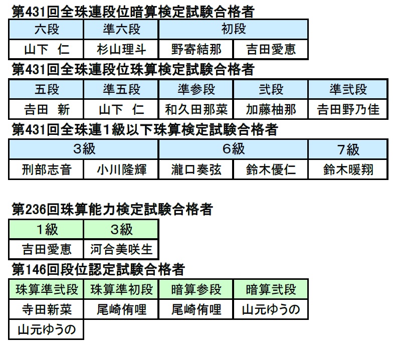 | 5級 | 平出 柚奈 | 澤井 恒明 | 鈴木 崚太 | 渡邊 慎太郎 | 松下 優斗 |